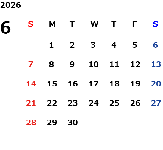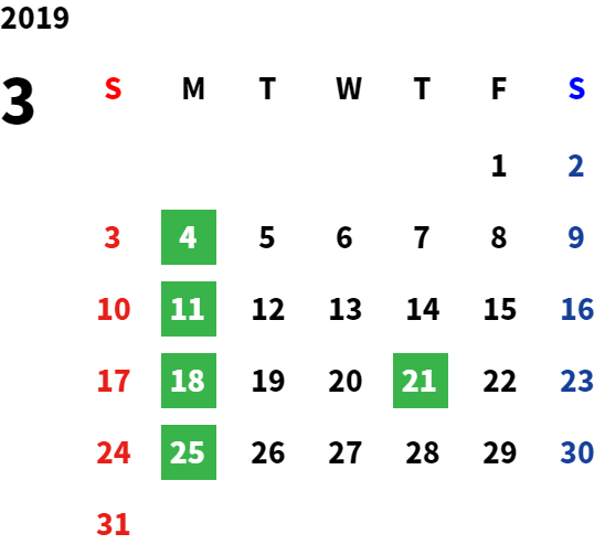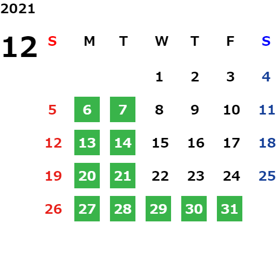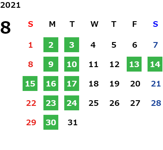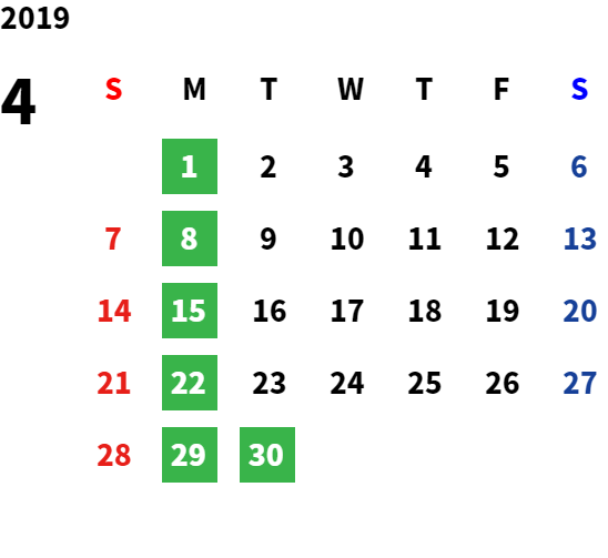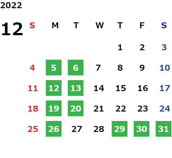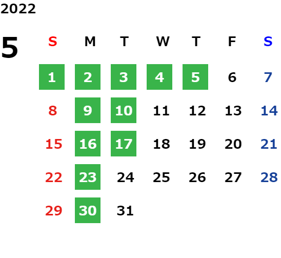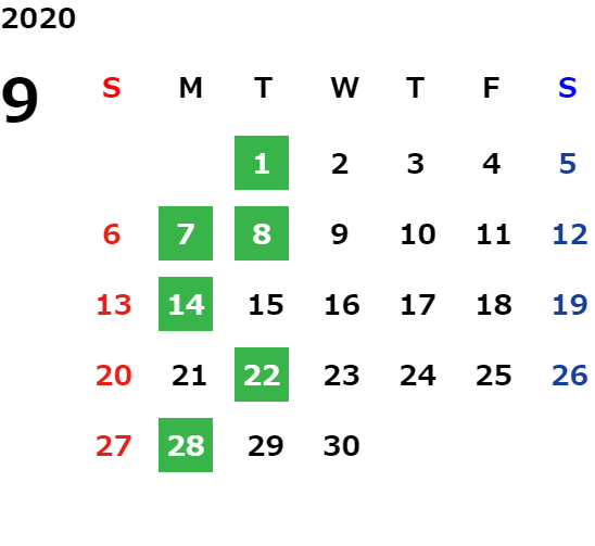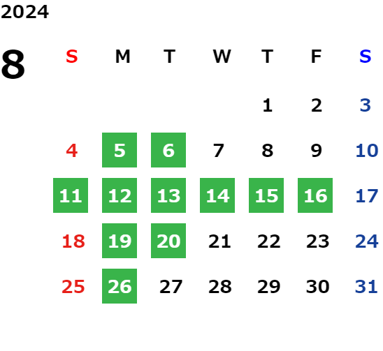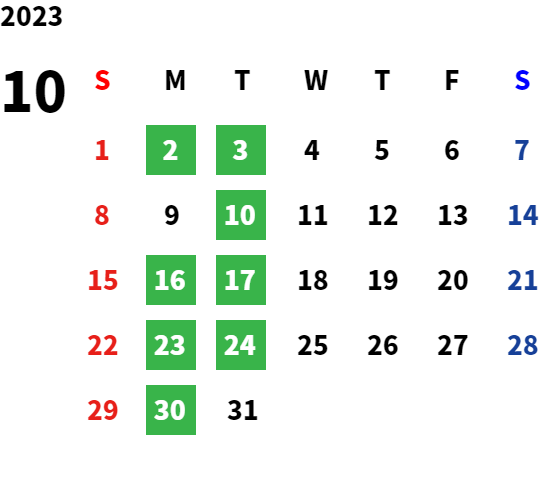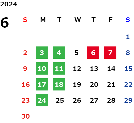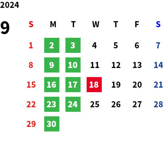 毎週月曜日と火曜日が基本定休日となります。詳しくはカレンダーをご覧ください。