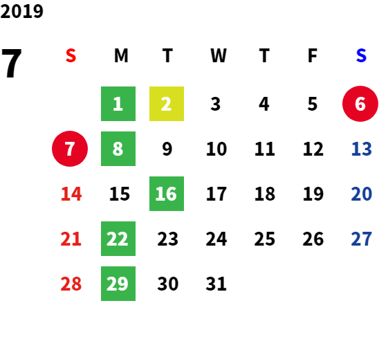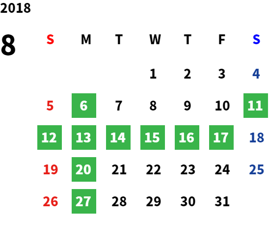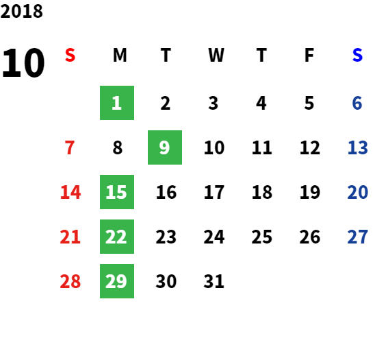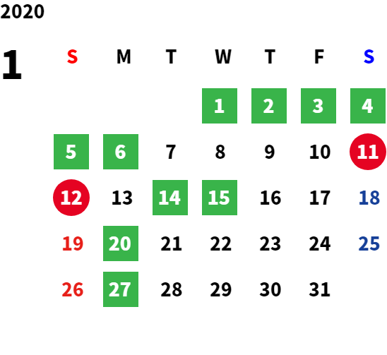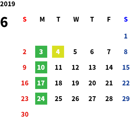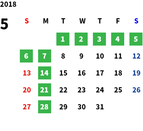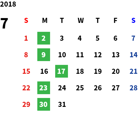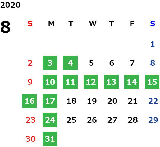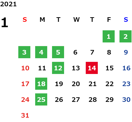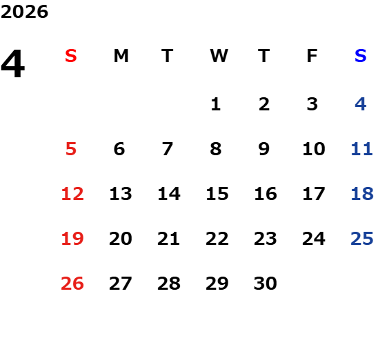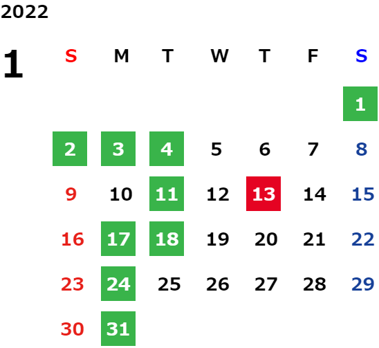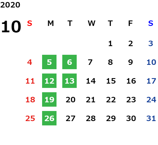 毎週月曜日と火曜日が基本定休日となります。詳しくはカレンダーをご覧ください。