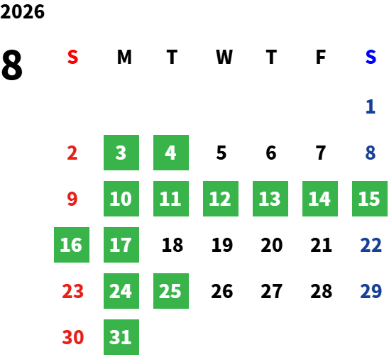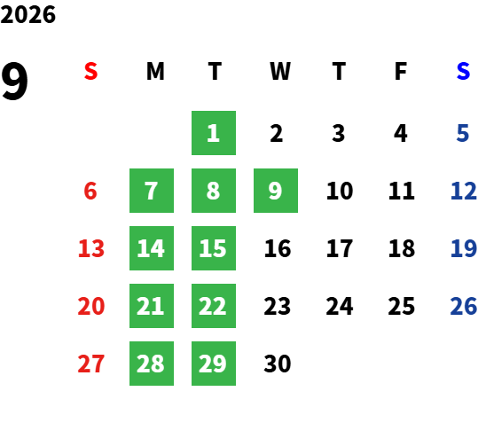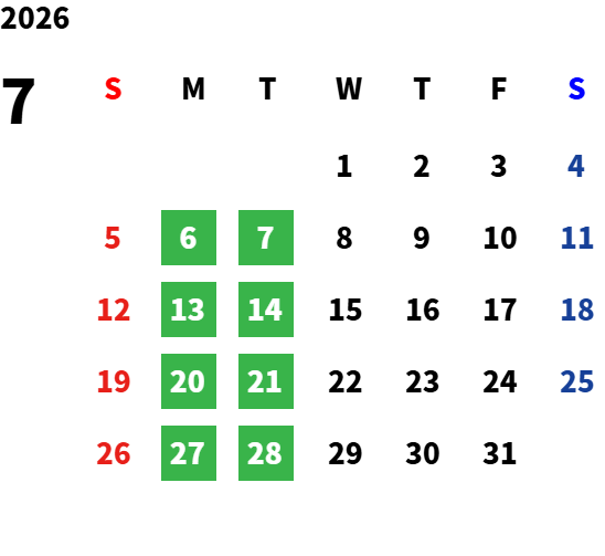 毎週月曜日と火曜日が基本定休日となります。詳しくはカレンダーをご覧ください。