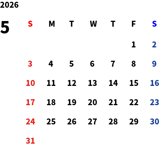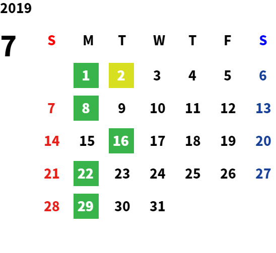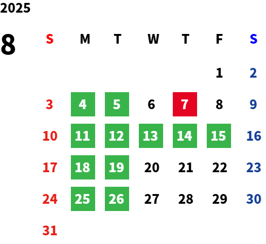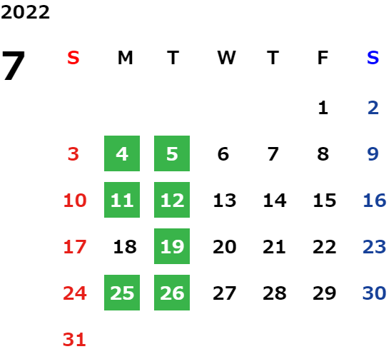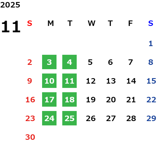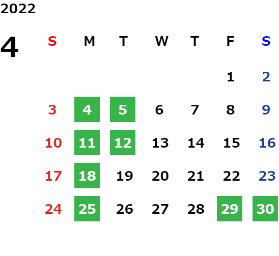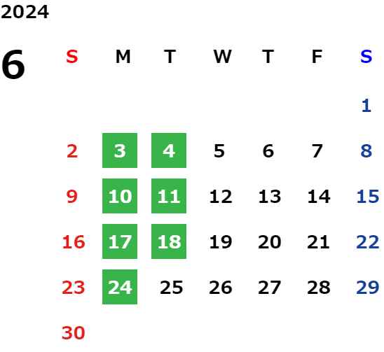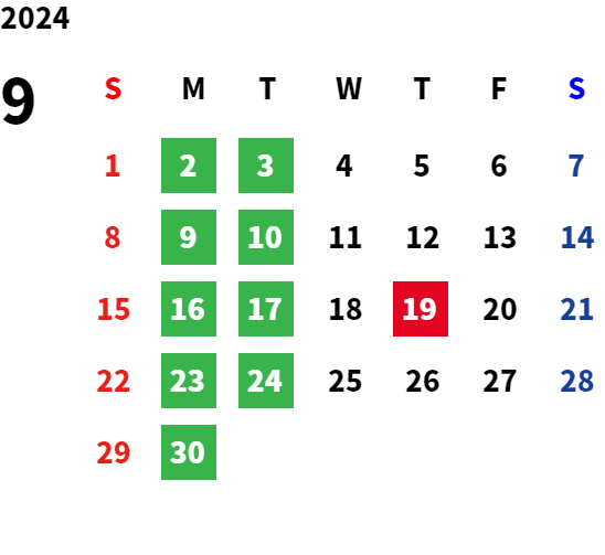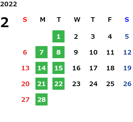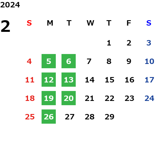 毎週月曜日と火曜日が基本定休日となります。詳しくはカレンダーをご覧ください。